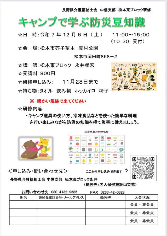 キャンプ道具を使いながら、簡単な調理や防災の知識を学びましょう。